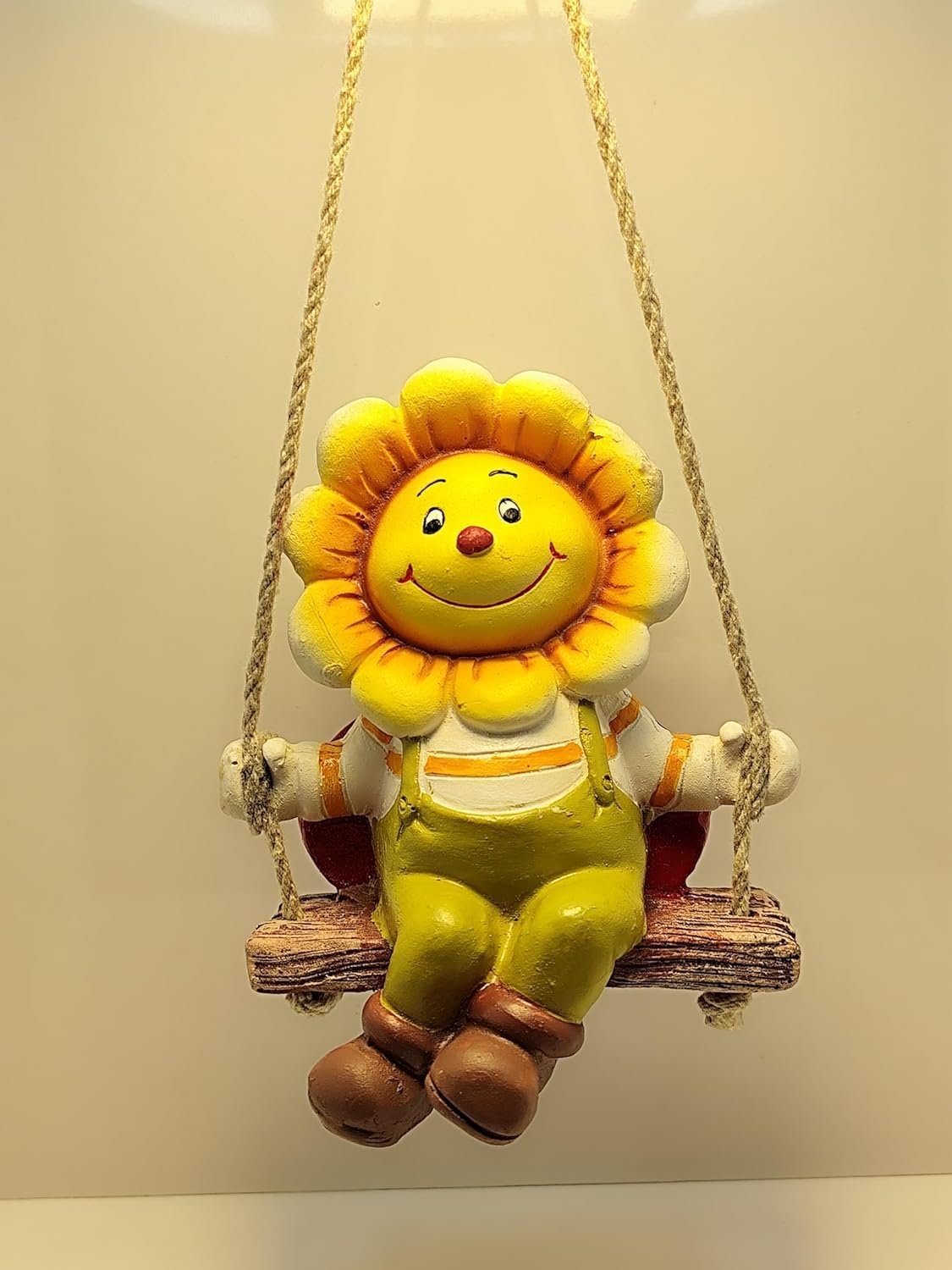 Add a Touch of Sunshine to Your Space with this Swinging Sunflower! Brighten your day every time you step outside with this delightful Whimsical Sunflower on a Swing Figurine. This charming statue features a smiling sunflower character, complete with a striped shirt and green overalls, perched happily on a miniature log swing. Crafted from heavy-duty, weather-resistant resin, this statue is built to last and maintain its vivid colors through all seasons. The lifelike texture of the petals and the realistic appearance of the wooden swing add to its rustic, charming appeal. It’s the perfect size for hanging on your porch, beside your front door, in a sunroom, or from a favorite tree branch in your garden. This Hanging Flower Statue is not just decor; it’s a mood lifter, bringing continuous cheer and positive energy to your home. It makes a wonderful, unforgettable gift for friends and family who appreciate unique, joyful decorations.
